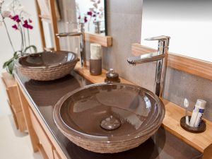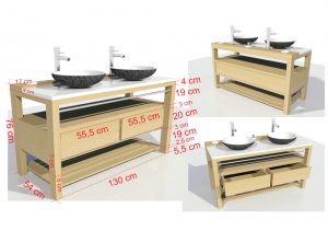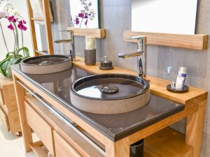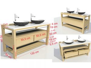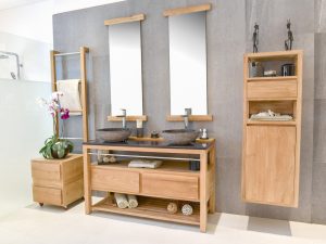 Un meuble de salle de bains sur pieds complet avec de nombreuses capacités de rangement : un large caisson comprenant un ou deux grands tiroirs (pour le Suoh 130), 2 étagères dont une équipée d’un plateau en lames de bois teck, une porte serviette en INOX, pot et distributeur de savon en pierre de lave émaillée (céramique). La combinaison bois de teck et plan sous-vasque en pierre de lave émaillée donne un rendu original et contemporain, une réalisation unique. Existe en 3 dimensions (80cm / 100cm / 130cm). Le meuble est livré monté, seul le plan sous vasque et la vasque sont à positionner.